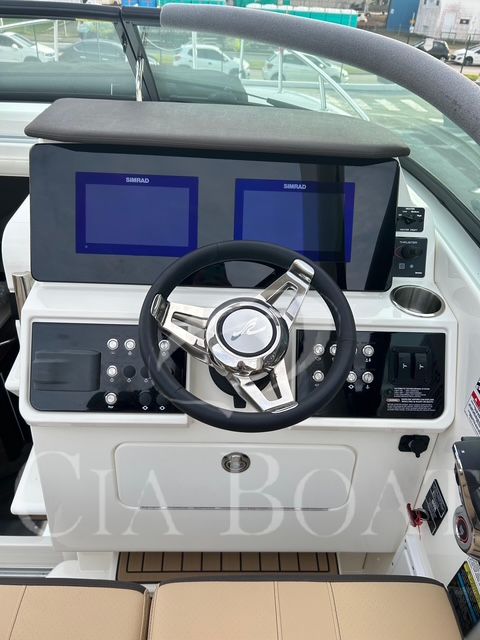 Painel Digital Mercury Simrad com duas telas de 9" que permite monitorar rpm, velocidade, fluxo e eficiência de combustível, temperatura e muito mais.