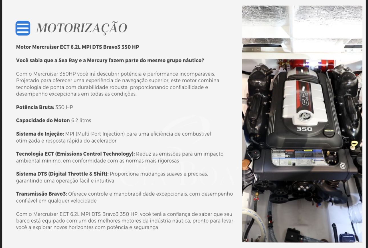 Com o Mercruiser ECT 6.2L MPI DTS Bravo3 350 HP, você terá a confiança de saber que seu barco está equipado com um dos melhores motores da indústria náutica, pronto para levar você a explorar novos horizontes com potência e segurança.