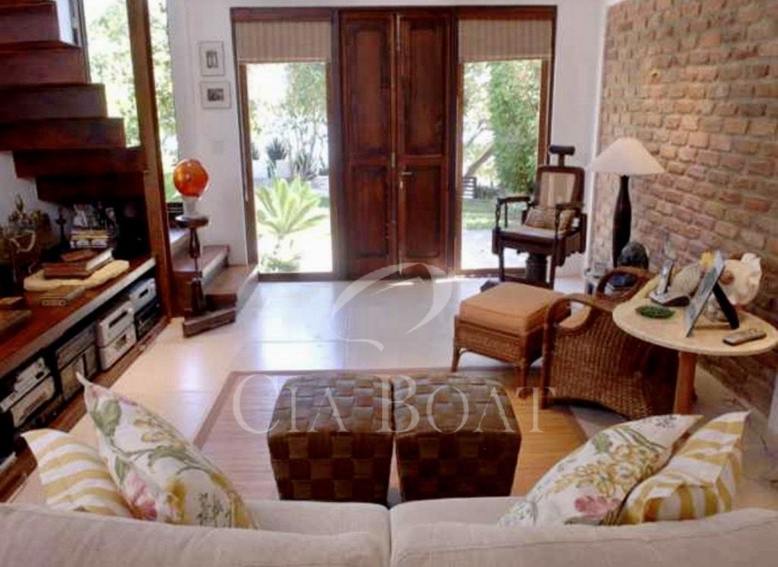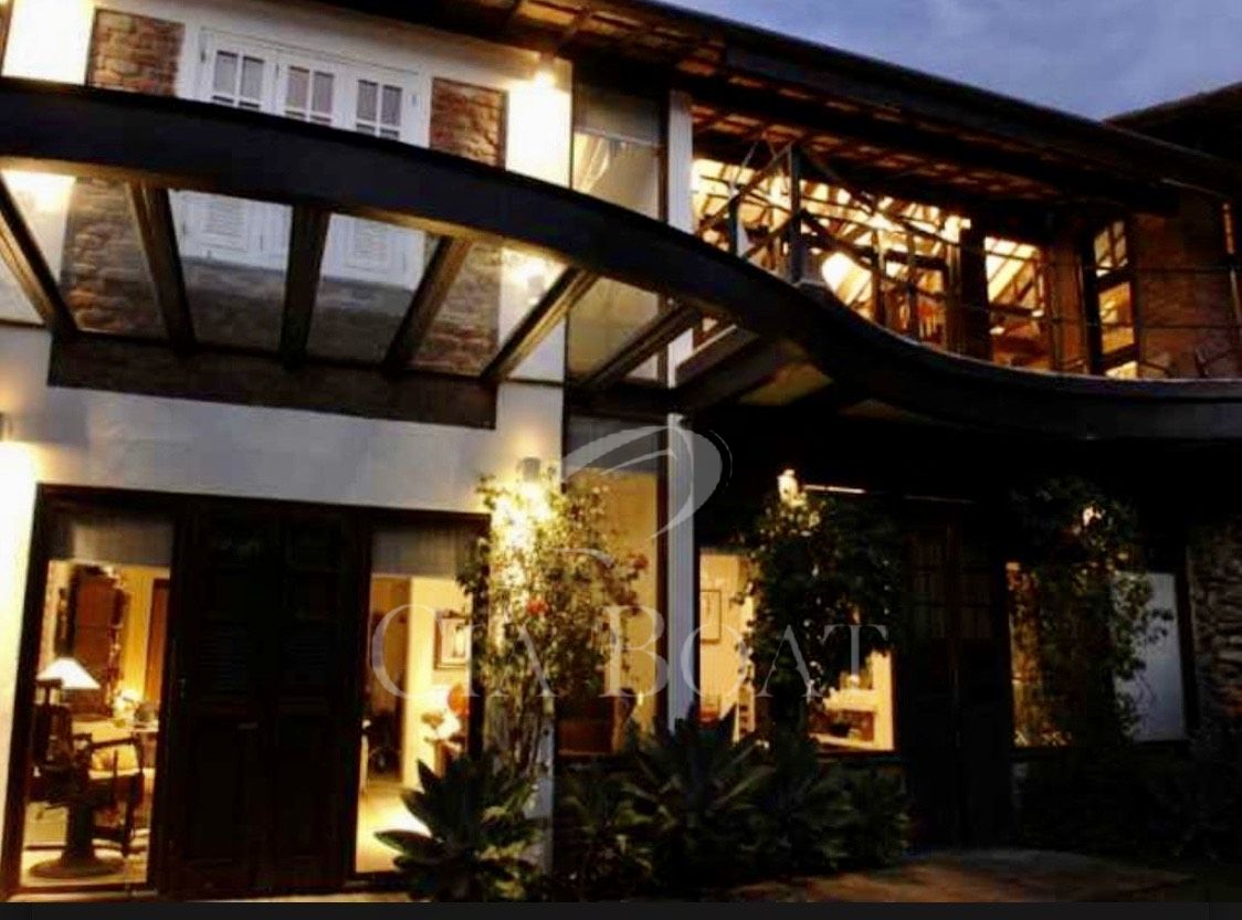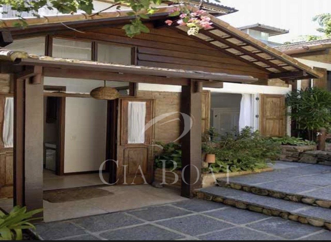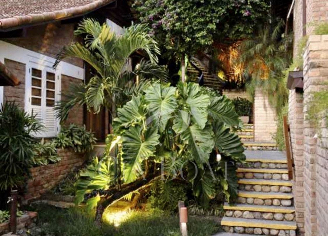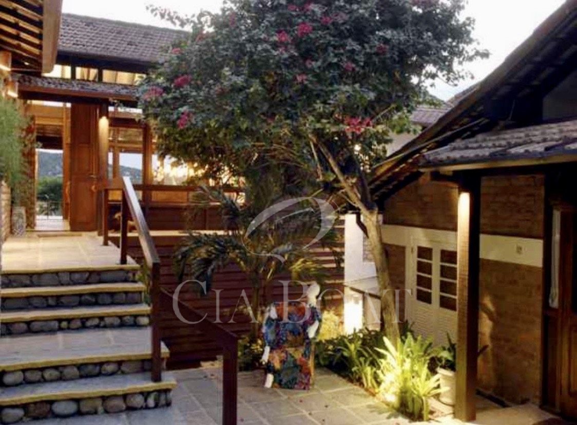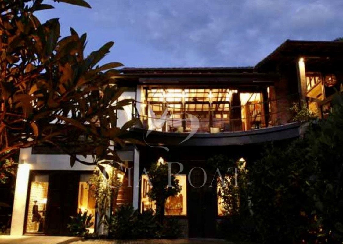 Tem no lote somente uma casa principal em forma de U, sendo as laterais esquerda e direita do U as suítes e salas em anexo dando vista para o jardim interno. Na parte lateral esquerda do U, dando vista para o muro de divisa com o vizinho, estão a lavanderia, a rouparia e os banheiros dos empregados. Na base do U tem 2 andares. No andar de cima estão as salas, cozinhas, lavabo, 2 suítes e varanda. No andar de baixo, nível do mar, estão o ‘hometheater’, o escritório, a suíte master com closet e a varanda coberta.