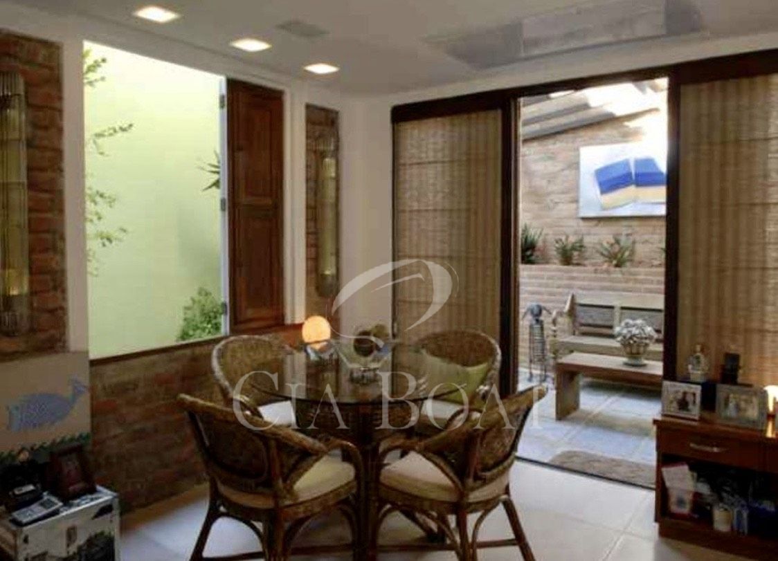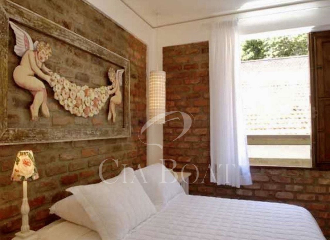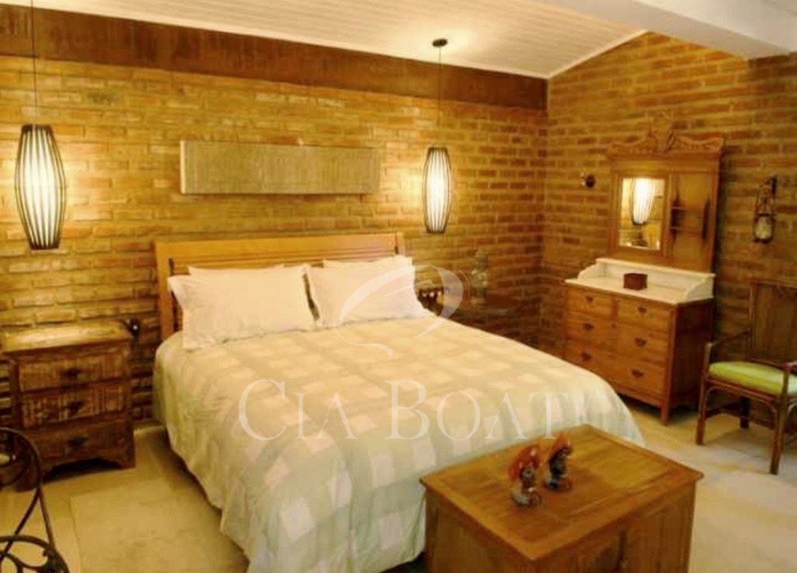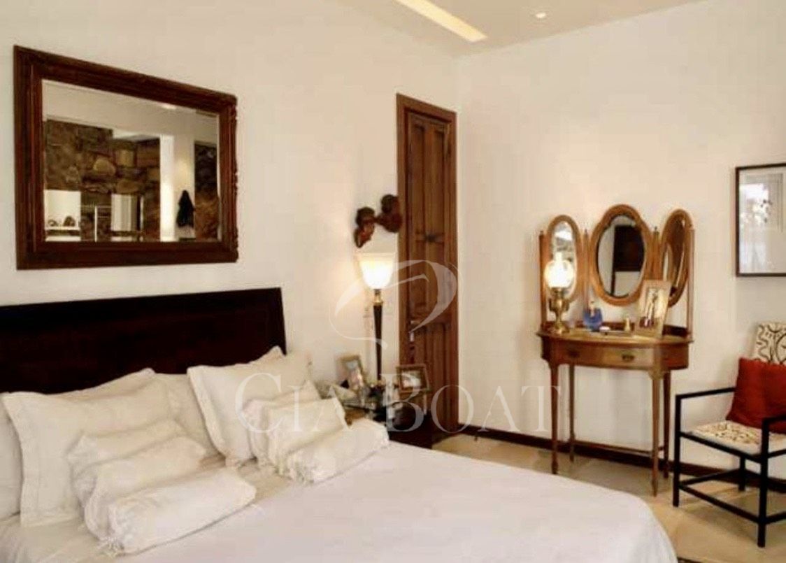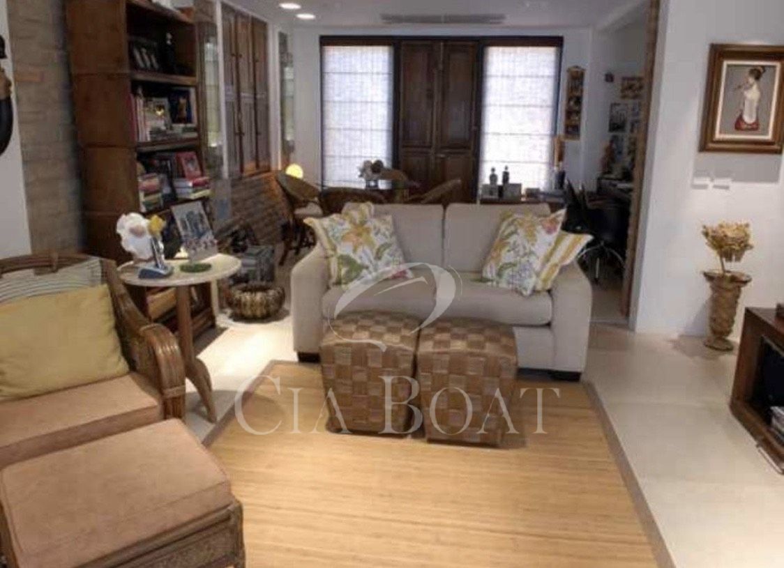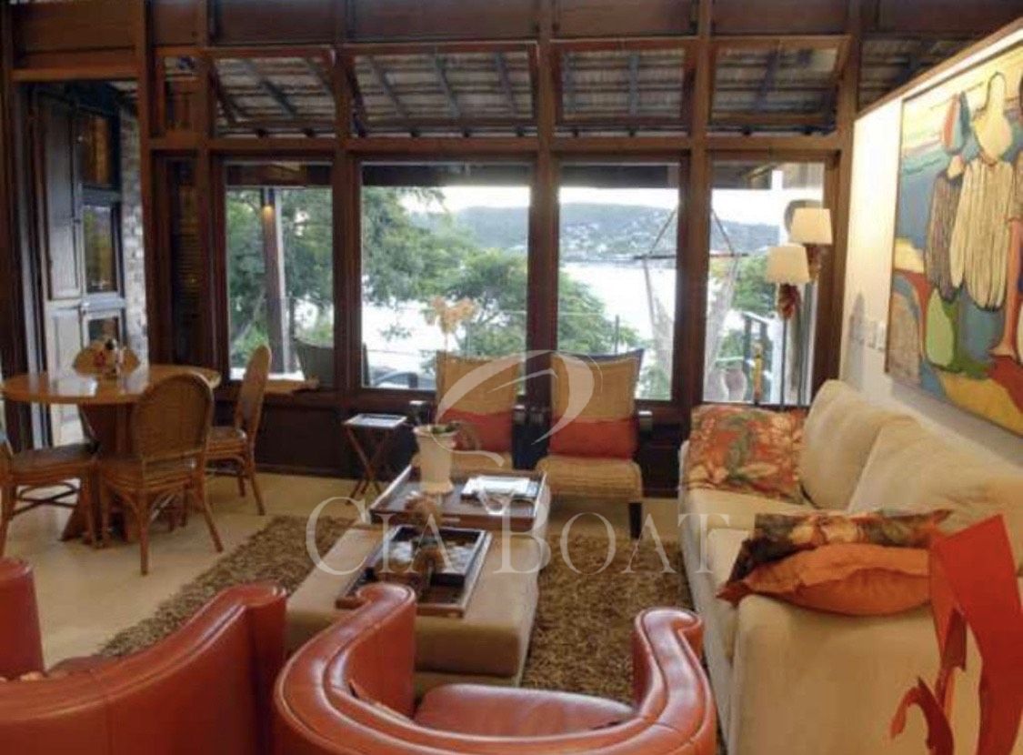 Tem no lote somente uma casa principal em forma de U, sendo as laterais esquerda e direita do U as suítes e salas em anexo dando vista para o jardim interno. Na parte lateral esquerda do U, dando vista para o muro de divisa com o vizinho, estão a lavanderia, a rouparia e os banheiros dos empregados. Na base do U tem 2 andares. No andar de cima estão as salas, cozinhas, lavabo, 2 suítes e varanda. No andar de baixo, nível do mar, estão o ‘hometheater’, o escritório, a suíte master com closet e a varanda coberta.