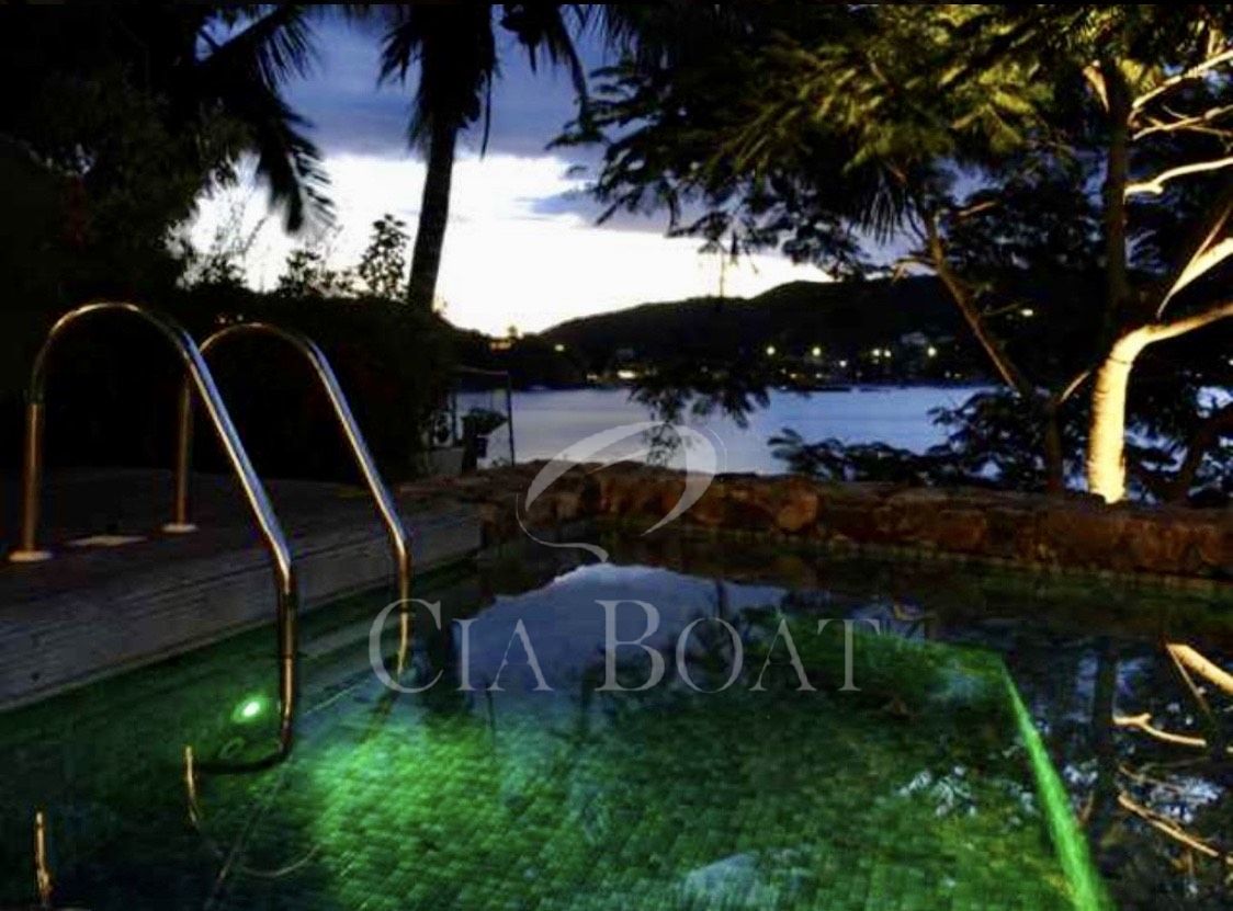 Possui uma jacuzzi com capacidade para 12 pessoas com hidromassagem e aquecimento, rodeada por deck de madeira, com vista para o mar. Deck de madeira em frente à suíte máster, ao hometheater. e à lateral do escritório. Gramado frente ao mar.