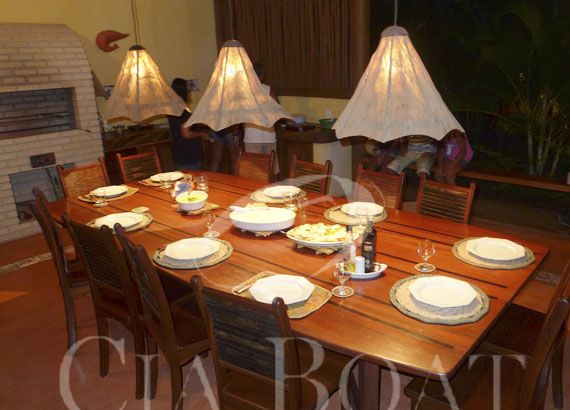 Ou, se preferir você escolhe outro pavilhão, aberto, com três faces com vista para as árvores e na quarta face uma grande lareira ao ar livre com churrasqueira. Aqui, 14 pessoas podem apreciar um jantar tranquilo, em uma maravilhosa mesa de madeira torneada a mão, com cadeiras confortáveis.