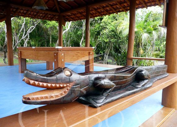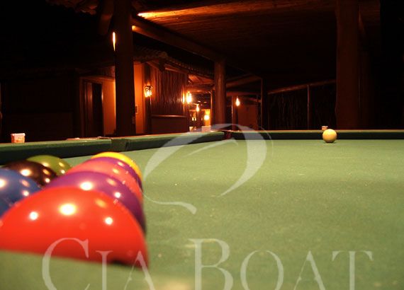 Da churrasqueira segue um deck de madeira para outro pavilhão, totalmente aberto, que convida para um jogo numa mesa de bilhar, com um jantar e algumas tacadas em suas bolas coloridas.