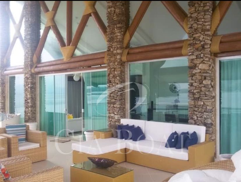 TV e ar, tem duas rampas para barcos, uma coberta, jardins, adega medieval, sala em pastilhas espelhadas, toda avaranda em blindex e sauna. Churrasqueira à beira mar, praia privativa, gerador de água e luz do continente em carta Náutica, duas jacuzzis, um deck serve como heliporto.